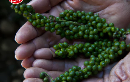 The Piper nigrum vine is characterised by its green leaves and fruits arranged in dense clusters, resembling grapes. When the fruit reaches a yellow-red colour, it signifies its maturity. Nevertheless, green fruits are used for black pepper. The appearance of 1-2 yellow or red fruits in a bunch is a signal for growers to start harvesting.