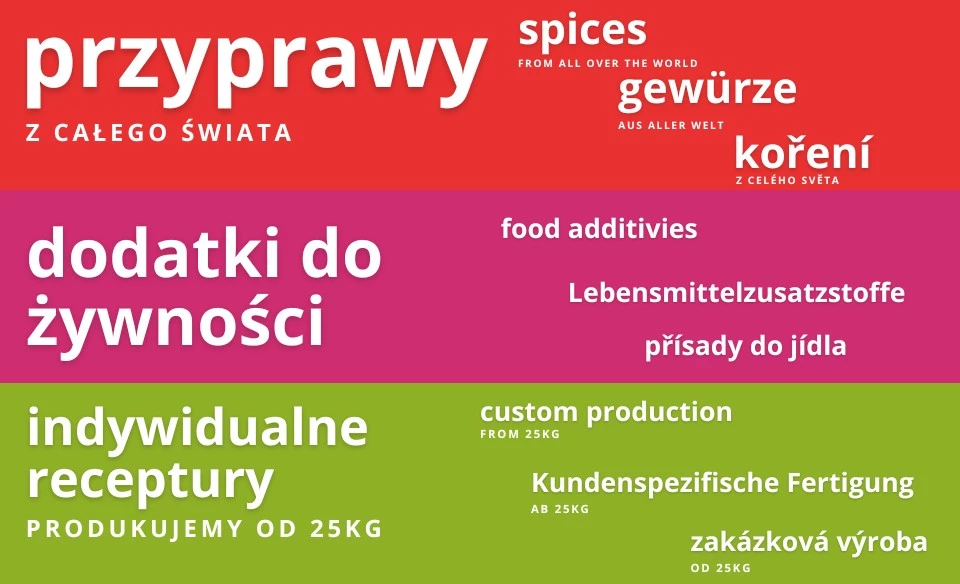 We supply Polish and foreign companies selling spices through the e-commerce channel. Our customers value repeatable quality, systematically appearing new products and innovative products. Customers from the e-commerce industry most often order our mixes with dried tomatoes, vanilla and homogeneous spices in bulk. When conducting online trade, it is worth focusing on natural spice mixtures without "E" additives.
