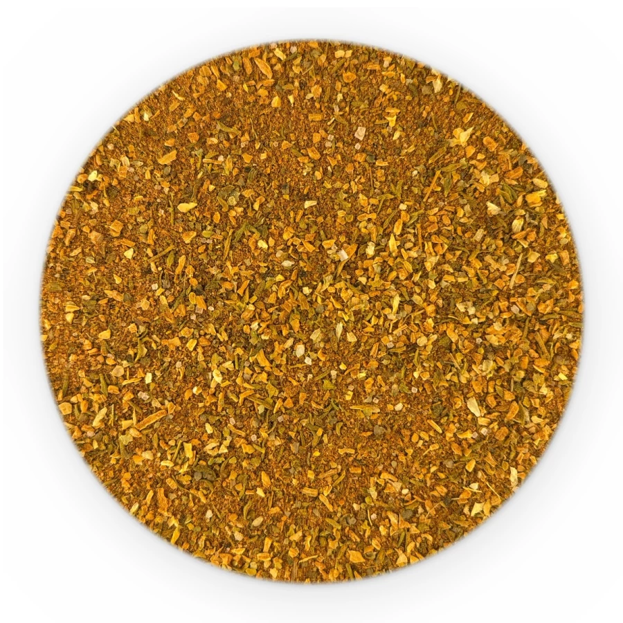 sól, papryka słodka, cebula, czosnek, gorczyca biała, kminek, cukier, kolendra, pieprz czarny, papryka ostra, kurkuma, skoncentrowany sok z buraka (60% maltodekstryna, 40% skoncentrowany sok z buraka); majeranek, tymianek, ziele angielskie, cząber.